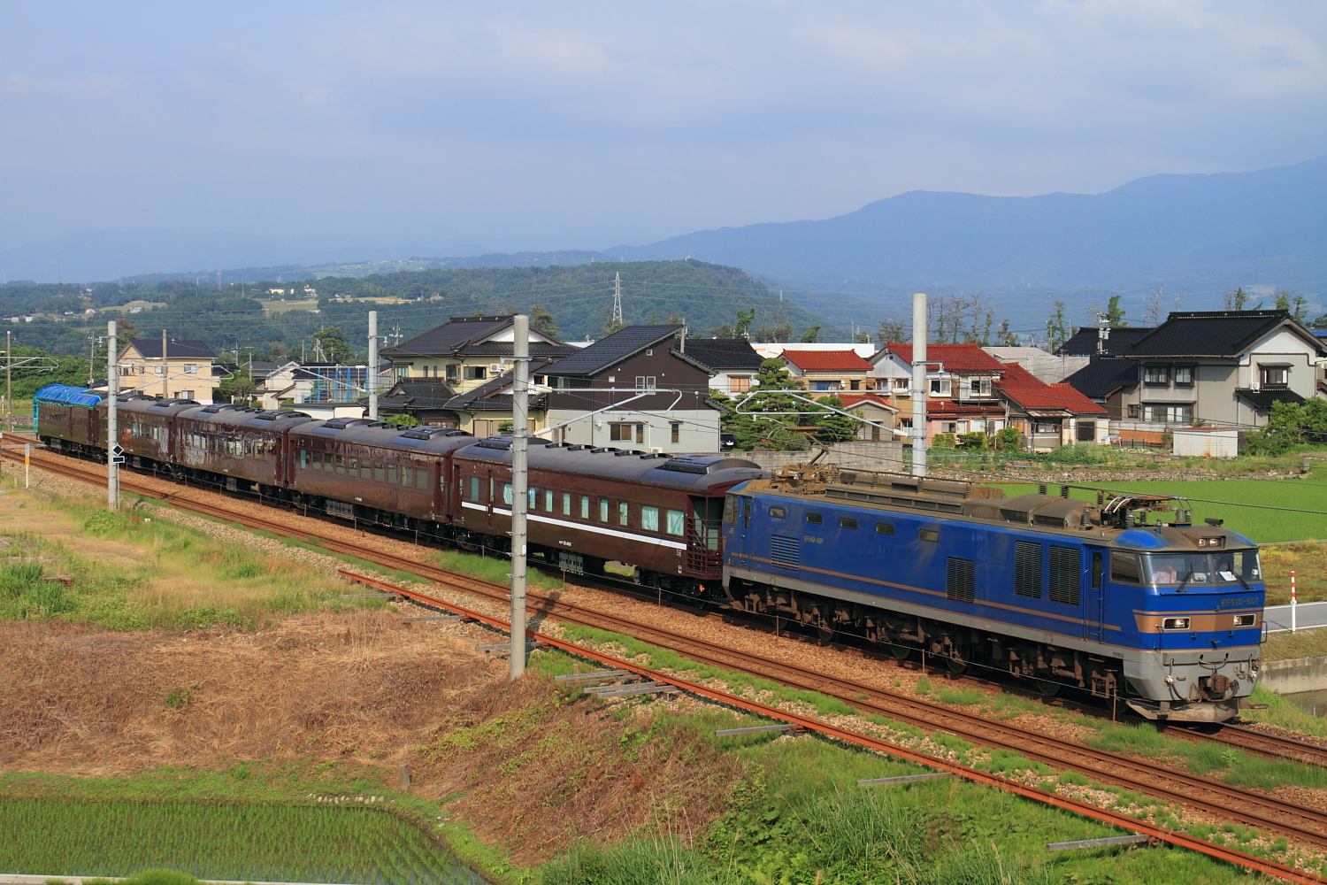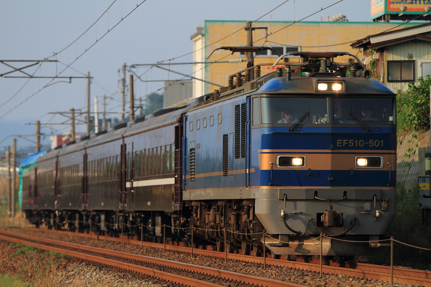 【あいの風とやま鉄道】35系甲種回送(8560レ)撮影【EF510】 H29.6.1仕事明け、体調不良でなんとか黒部・魚津までたどり着くと国道8号バイパスが完成しているではないですか。もちろん、ナビには無い道で久々に来たのですが随分前に完成していたようですね。通過した時に気になっていた場所で構えます。 8560レ@魚津〜黒部EF510 501号機牽引でした。青いEF510と旧型客車風の35系4000番台の甲種回送がゆっくりと通過していきました。この区間を1度しか走行しないであろう列車を撮影時は定番撮影地ではなく、誰もいない場所で記録をしたい気持ちが強く現れるのですが、この場所は同業さん1名でした。高速道路で帰宅ついでにもう1発撮影。 @森本〜津幡(IRいしかわ鉄道)いわゆる、ダイソーストレートで適当に撮影。こちらは数名の同業者さんがいらっしゃいまして、沿線住民の方々から物珍しそうな視線を浴びながら列車は通過して行きました。SLやまぐち号用の35系客車になるようで、今後が楽しみですね。 [2回]